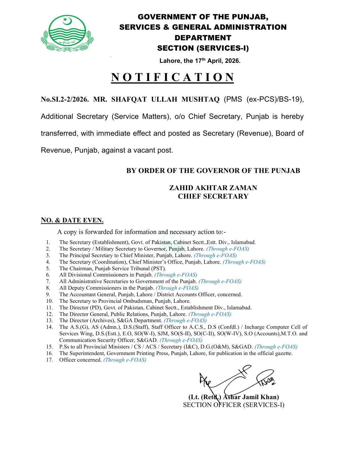 حکومت پنجاب نےتین افسران کے تقرر و تبادلے کے احکامات جاری کئے ہیں،شفقت اللہ مشتاق ایڈیشنل سیکرٹری سروس میٹرز ٹو چیف سیکرٹری کو سیکرٹری ریونیو تعینات کر دیا گیا ہے ،