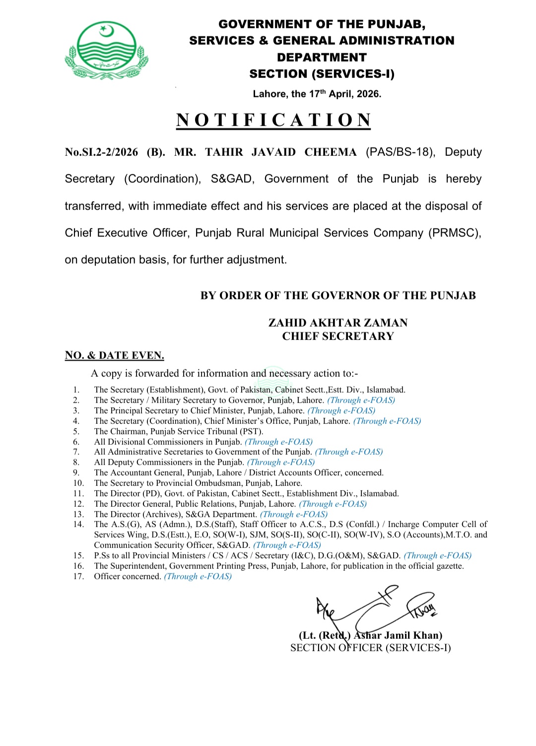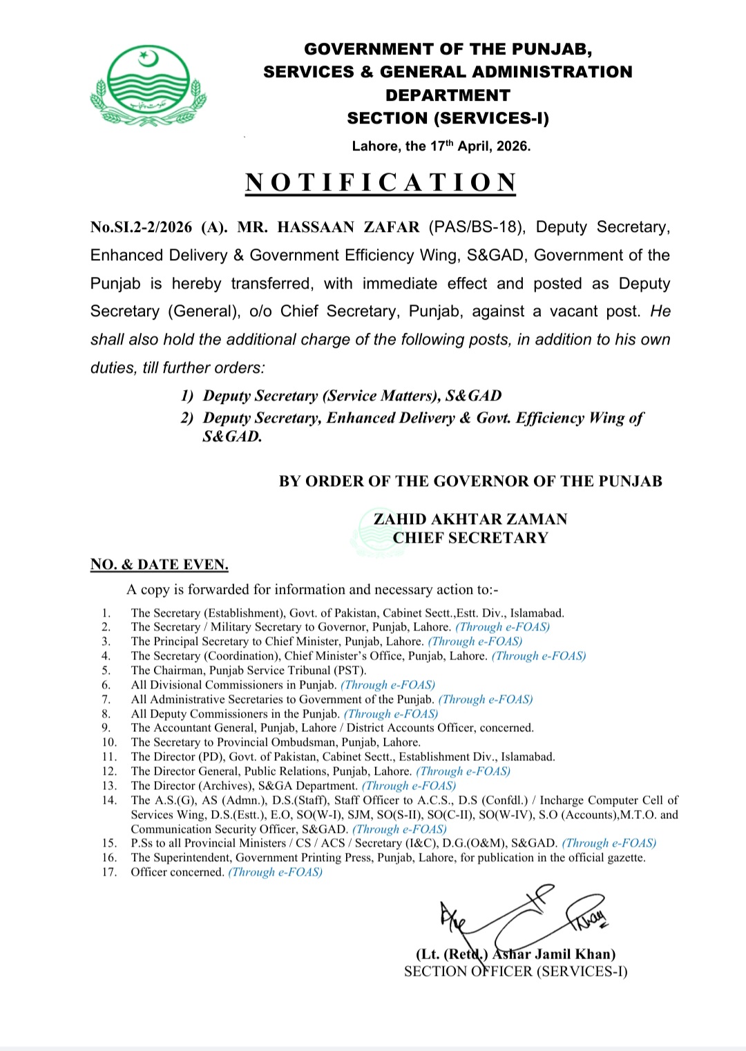 حسان ظفر ڈپٹی سیکرٹری انہانسڈ ڈیلیوری اینڈ گورنمنٹ ایفیشنسی ونگ کو ڈپٹی سیکرٹری جنرل ٹو چیف سیکرٹری تعینات کیا گیا ہے اور طاہر جاوید چیمہ ڈپٹی سیکرٹری کوآرڈینیشن ایس اینڈ جی اے ڈی کی خدماتِ چیف ایگزیکٹو آفیسر پنجاب روورل میونسپل سروسز کمپنی کے سپرد کر دی گئی ہیں ۔