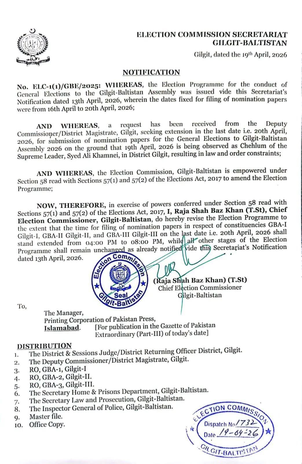 گلگت بلتستان اسمبلی کے انتخابات 7جون کو کرانے کا اعلان