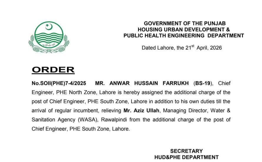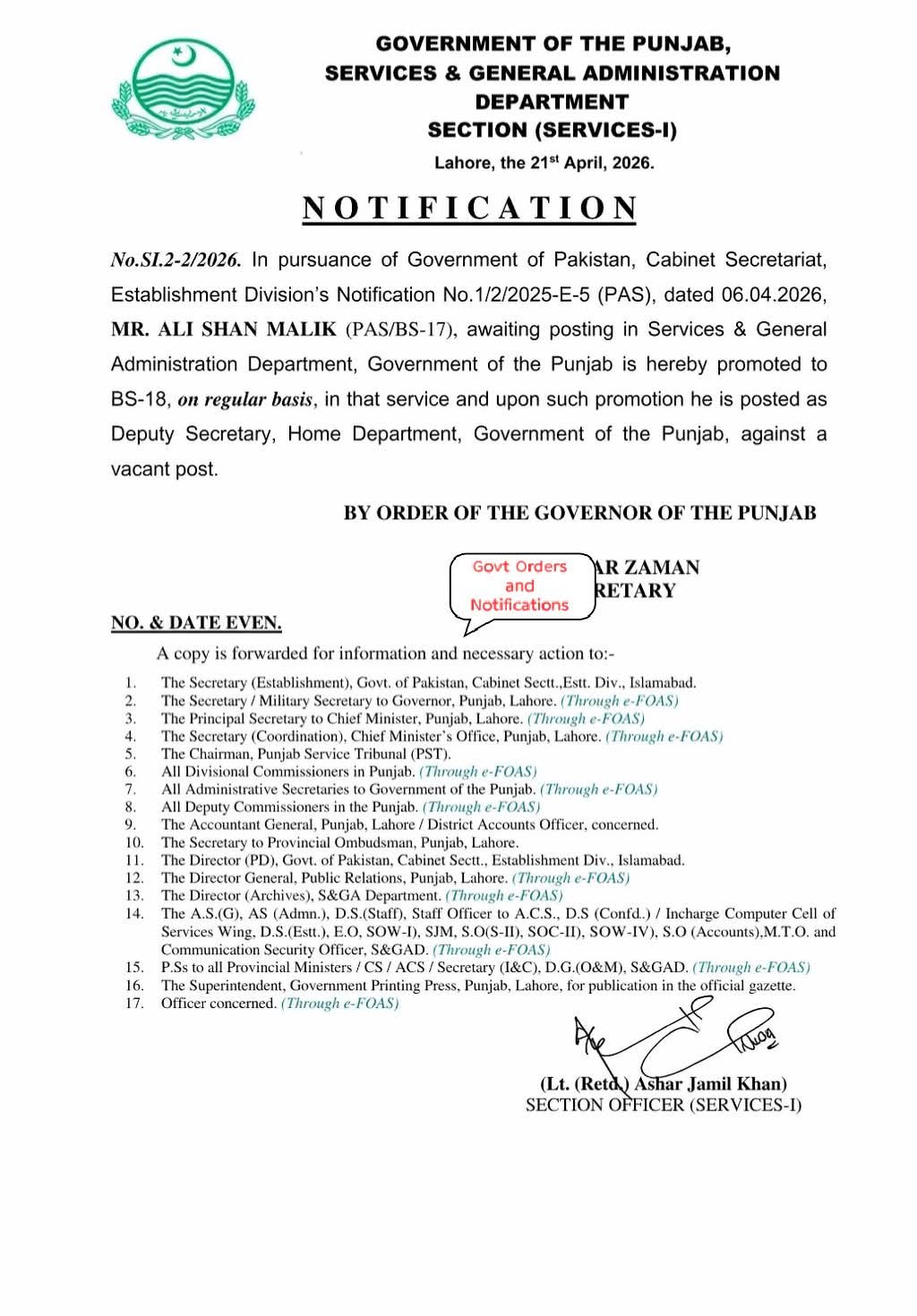 پنجاب تقرروتبادلے،31 اسسٹنٹ کمشنرز تبدیل،علی شان ملک ڈپٹی سیکرٹری داخلہ،انور حسین فرخ کو چیف انجینئر ساؤتھ پبلک ہیلتھ کا اضافی چارج تفویض
