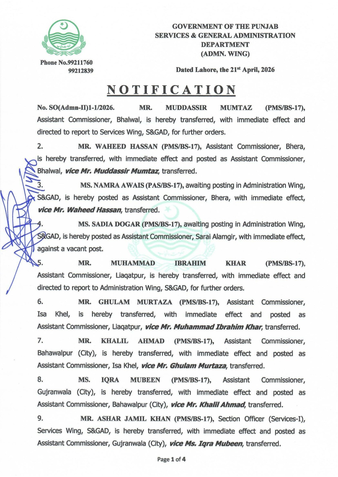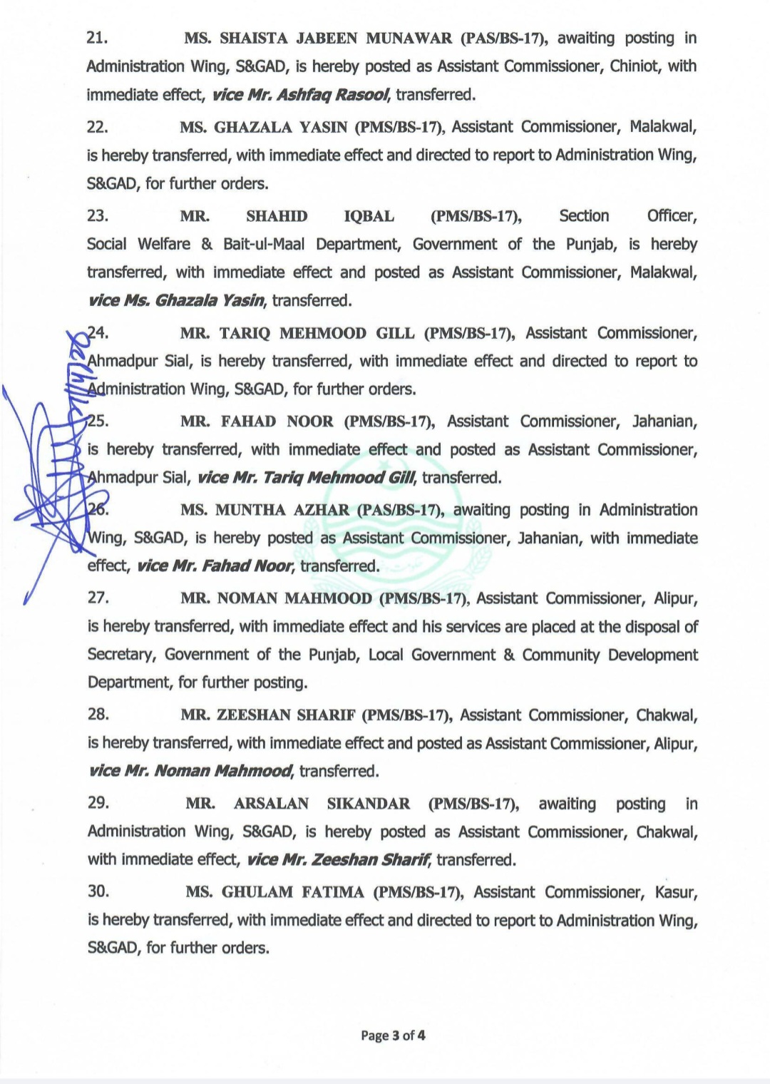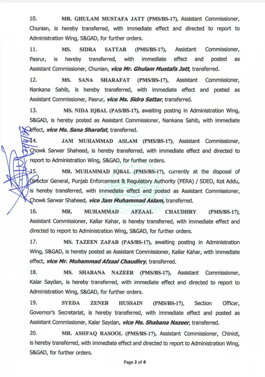 مدثر ممتاز اسسٹنٹ کمشنر، بھلوال کو فوری طور پر تبدیل کر دیا گیا ہے اور انہیں مزید احکامات کے لیے سروسز ونگ، S&GAD کو رپورٹ کرنے کی ہدایت کی گئی ہے۔ وحید حسن اسسٹنٹ کمشنر، بھیرہ، کو فوری طور پر تبدیل کیا گیا ہے اور مسٹر مدثر ممتاز کی جگہ اسسٹنٹ کمشنر، بھلوال تعینات کیا گیا ہے۔نمرہ اویس کواسسٹنٹ کمشنر، بھیرہ کے طور پر تعینات کیا گیا ہے۔ تقرری کی منتظر سعدیہ ڈوگر کو اسسٹنٹ کمشنر، سرائے عالمگیر کے طور پر ایک خالی آسامی پر تعینات کیا گیا ہے۔محمد ابراہیم کھر اسسٹنٹ کمشنر، لیاقت پور، کو فوری طور پر تبدیل کر دیا گیا ہے اور انہیں مزید احکامات کے لیے ایڈمنسٹریشن ونگ، S&GAD کو رپورٹ کرنے کی ہدایت کی گئی ہے۔غلام مرتضیٰ اسسٹنٹ کمشنر عیسیٰ خیل کو فوری طور پر تبدیل کر کے اسسٹنٹ کمشنر لیاقت پور تعینات کیا گیا ہے۔خلیل احمد (PMS/BS-17)، اسسٹنٹ کمشنر، بہاولپور (سٹی) کو فوری طور پر تبدیل کر کے اسسٹنٹ کمشنر عیسیٰ خیل تعینات کیا گیا ہے۔اقراء مبین اسسٹنٹ کمشنر، گوجرانوالہ (سٹی) کو فوری طور پر تبدیل کر کے اسسٹنٹ کمشنر بہاولپور (سٹی) تعینات کیا گیا ہے، اشعر جمیل خان سیکشن آفیسر (سروسز-I)، سروسز ونگ، S&GAD، کو فوری طور پر تبدیل کر کے اسسٹنٹ کمشنر، گوجرانوالہ (سٹی)، محترمہ اقرا مبین کی جگہ تعینات کیا گیا ہے۔ غلام مصطفٰی جٹ اسسٹنٹ کمشنر چونیاں کو فوری طور پر تبدیل کر دیا گیا ہے اور انہیں مزید احکامات کے لیے ایڈمنسٹریشن ونگ، S&GAD کو رپورٹ کرنے کی ہدایت کی گئی ہے۔ سدرہ ستار اسسٹنٹ کمشنر پسرور کو فوری طور پر تبدیل کر کے اسسٹنٹ کمشنر چونیاں تعینات کیا گیا ہے، ثناء شرافت اسسٹنٹ کمشنر ننکانہ صاحب کا فوری اثر سے تبادلہ کیا گیا ہے اور محترمہ سدرہ ستار کی جگہ اسسٹنٹ کمشنر پسرور تعینات کیا گیا ہے۔ ندا اقبال (PAS/BS-17) جو ایڈمنسٹریشن ونگ، S&GAD میں تعیناتی کے منتظر ہیں، کو فوری اثر کے ساتھ، محترمہ ثنا شرافت کی جگہ اسسٹنٹ کمشنر، ننکانہ صاحب کے طور پر تعینات کیا گیا ہے۔جام محمد اسلم اسسٹنٹ کمشنر، چوک سرور شہید، کو فوری طور پر تبدیل کر دیا گیا ہے اور انہیں مزید احکامات کے لیے ایڈمنسٹریشن ونگ، S&GAD کو رپورٹ کرنے کی ہدایت کی گئی ہے۔محمد اقبال جو اس وقت ڈائریکٹر جنرل، پنجاب انفورسمنٹ اینڈ ریگولیٹری اتھارٹی (PERA) / SDEO، کوٹ ادو کے اختیار میں ہیں، کو فوری طور پر تبدیل کر کے اسسٹنٹ کمشنر چوک سرور شہید، جام محمد اسلم کی جگہ تعینات کیا گیا ہے۔محمد افضل چوہدری اسسٹنٹ کمشنر، کلر کہار کو فوری طور پر تبدیل کر دیا گیا ہے اور انہیں مزید احکامات کے لیے ایڈمنسٹریشن ونگ، S&GAD کو رپورٹ کرنے کی ہدایت کی گئی ہے۔ تزین ظفر ایڈمنسٹریشن ونگ، S&GAD میں تعیناتی کے منتظر، کو اسسٹنٹ کمشنر، کلر کہار کے طور پر تعینات کیا گیا ہے۔شبانہ نذیراسسٹنٹ کمشنر، کلر سیداں کو فوری طور پر تبدیل کر دیا گیا ہے اور انہیں مزید احکامات کے لیے ایڈمنسٹریشن ونگ، S&GAD کو رپورٹ کرنے کی ہدایت کی گئی ہے۔سیدہ زینب حسین (PMS/BS-17)، سیکشن آفیسر، گورنر سیکرٹریٹ، کا فوری اثر سے تبادلہ کیا گیا ہے اور شبانہ نذیر کی جگہ اسسٹنٹ کمشنر کلر سیداں تعینات کیا گیا ہے۔ اشفاق رسول اسسٹنٹ کمشنر، چنیوٹ کو فوری طور پر تبدیل کر دیا گیا ہے اور انہیں مزید احکامات کے لیے ایڈمنسٹریشن ونگ، S&GAD کو رپورٹ کرنے کی ہدایت کی گئی ہے۔ایڈمنسٹریشن ونگ، S&GAD میں تعیناتی کی منتظر شائستہ جبین منور کو فوری طور پر اشفاق رسول کی جگہ اسسٹنٹ کمشنر چنیوٹ تعینات کیا گیا ہے۔غزالہ یاسین اسسٹنٹ کمشنر، ملکوال کو فوری طور پر تبدیل کر دیا گیا ہے اور انہیں مزید احکامات کے لیے ایڈمنسٹریشن ونگ، S&GAD کو رپورٹ کرنے کی ہدایت کی گئی ہے۔شاہد اقبال سیکشن آفیسر، سوشل ویلفیئر اینڈ بیت المال ڈیپارٹمنٹ، حکومت پنجاب، کو فوری طور پر تبدیل کر کے اسسٹنٹ کمشنر، ملکوال تعینات کیا گیا ہے۔طارق محمود گل اسسٹنٹ کمشنر، احمد پور سیال کو فوری طور پر تبدیل کر دیا گیا ہے اور انہیں مزید احکامات کے لیے ایڈمنسٹریشن ونگ، S&GAD کو رپورٹ کرنے کی ہدایت کی گئی ہے۔ فہد نور اسسٹنٹ کمشنر، جہانیاں، 