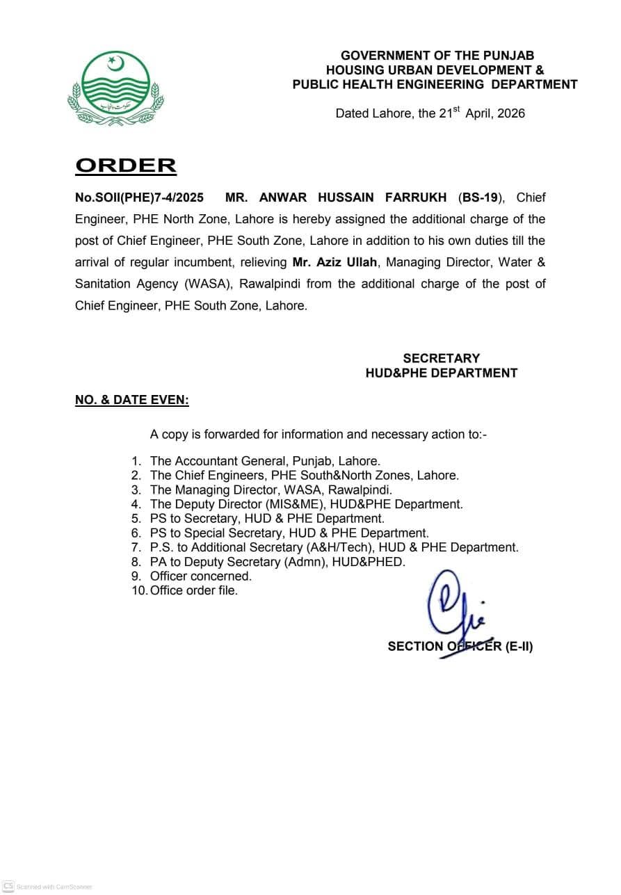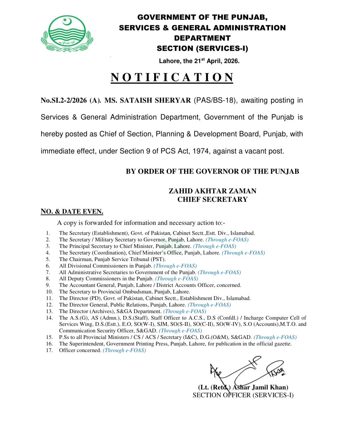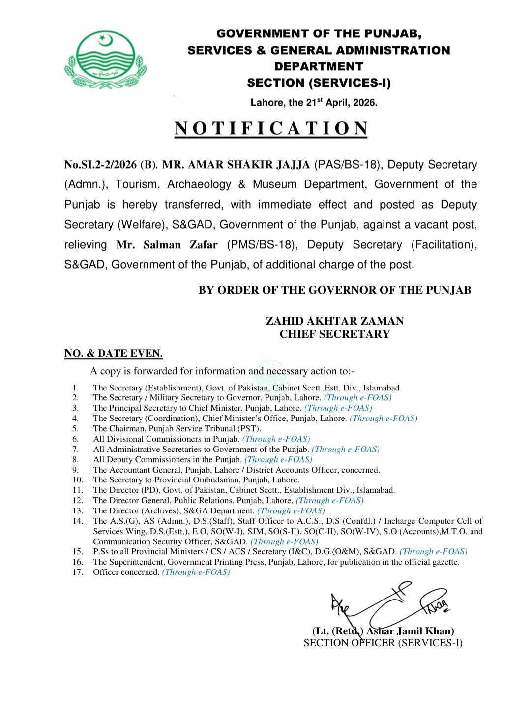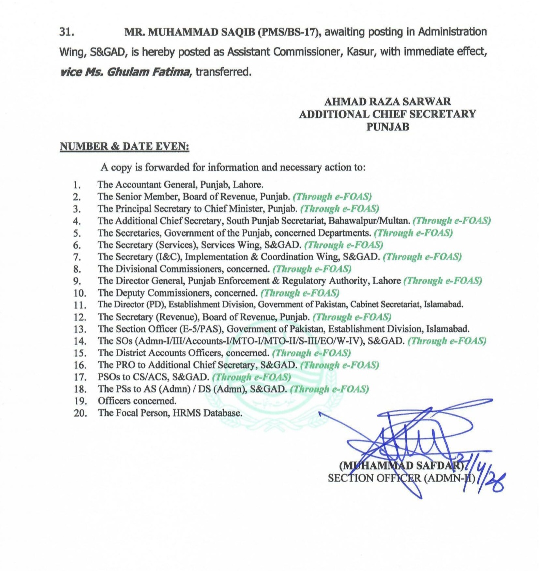 مدثر ممتاز اسسٹنٹ کمشنر، بھلوال کو فوری طور پر تبدیل کر دیا گیا ہے اور انہیں مزید احکامات کے لیے سروسز ونگ، S&GAD کو رپورٹ کرنے کی ہدایت کی گئی ہے۔ وحید حسن اسسٹنٹ کمشنر، بھیرہ، کو فوری طور پر تبدیل کیا گیا ہے اور مسٹر مدثر ممتاز کی جگہ اسسٹنٹ کمشنر، بھلوال تعینات کیا گیا ہے۔نمرہ اویس کواسسٹنٹ کمشنر، بھیرہ کے طور پر تعینات کیا گیا ہے۔ تقرری کی منتظر سعدیہ ڈوگر کو اسسٹنٹ کمشنر، سرائے عالمگیر کے طور پر ایک خالی آسامی پر تعینات کیا گیا ہے۔محمد ابراہیم کھر اسسٹنٹ کمشنر، لیاقت پور، کو فوری طور پر تبدیل کر دیا گیا ہے اور انہیں مزید احکامات کے لیے ایڈمنسٹریشن ونگ، S&GAD کو رپورٹ کرنے کی ہدایت کی گئی ہے۔غلام مرتضیٰ اسسٹنٹ کمشنر عیسیٰ خیل کو فوری طور پر تبدیل کر کے اسسٹنٹ کمشنر لیاقت پور تعینات کیا گیا ہے۔خلیل احمد (PMS/BS-17)، اسسٹنٹ کمشنر، بہاولپور (سٹی) کو فوری طور پر تبدیل کر کے اسسٹنٹ کمشنر عیسیٰ خیل تعینات کیا گیا ہے۔اقراء مبین اسسٹنٹ کمشنر، گوجرانوالہ (سٹی) کو فوری طور پر تبدیل کر کے اسسٹنٹ کمشنر بہاولپور (سٹی) تعینات کیا گیا ہے، اشعر جمیل خان سیکشن آفیسر (سروسز-I)، سروسز ونگ، S&GAD، کو فوری طور پر تبدیل کر کے اسسٹنٹ کمشنر، گوجرانوالہ (سٹی)، محترمہ اقرا مبین کی جگہ تعینات کیا گیا ہے۔ غلام مصطفٰی جٹ اسسٹنٹ کمشنر چونیاں کو فوری طور پر تبدیل کر دیا گیا ہے اور انہیں مزید احکامات کے لیے ایڈمنسٹریشن ونگ، S&GAD کو رپورٹ کرنے کی ہدایت کی گئی ہے۔ سدرہ ستار اسسٹنٹ کمشنر پسرور کو فوری طور پر تبدیل کر کے اسسٹنٹ کمشنر چونیاں تعینات کیا گیا ہے، ثناء شرافت اسسٹنٹ کمشنر ننکانہ صاحب کا فوری اثر سے تبادلہ کیا گیا ہے اور محترمہ سدرہ ستار کی جگہ اسسٹنٹ کمشنر پسرور تعینات کیا گیا ہے۔ ندا اقبال (PAS/BS-17) جو ایڈمنسٹریشن ونگ، S&GAD میں تعیناتی کے منتظر ہیں، کو فوری اثر کے ساتھ، محترمہ ثنا شرافت کی جگہ اسسٹنٹ کمشنر، ننکانہ صاحب کے طور پر تعینات کیا گیا ہے۔جام محمد اسلم اسسٹنٹ کمشنر، چوک سرور شہید، کو فوری طور پر تبدیل کر دیا گیا ہے اور انہیں مزید احکامات کے لیے ایڈمنسٹریشن ونگ، S&GAD کو رپورٹ کرنے کی ہدایت کی گئی ہے۔محمد اقبال جو اس وقت ڈائریکٹر جنرل، پنجاب انفورسمنٹ اینڈ ریگولیٹری اتھارٹی (PERA) / SDEO، کوٹ ادو کے اختیار میں ہیں، کو فوری طور پر تبدیل کر کے اسسٹنٹ کمشنر چوک سرور شہید، جام محمد اسلم کی جگہ تعینات کیا گیا ہے۔محمد افضل چوہدری اسسٹنٹ کمشنر، کلر کہار کو فوری طور پر تبدیل کر دیا گیا ہے اور انہیں مزید احکامات کے لیے ایڈمنسٹریشن ونگ، S&GAD کو رپورٹ کرنے کی ہدایت کی گئی ہے۔ تزین ظفر ایڈمنسٹریشن ونگ، S&GAD میں تعیناتی کے منتظر، کو اسسٹنٹ کمشنر، کلر کہار کے طور پر تعینات کیا گیا ہے۔شبانہ نذیراسسٹنٹ کمشنر، کلر سیداں کو فوری طور پر تبدیل کر دیا گیا ہے اور انہیں مزید احکامات کے لیے ایڈمنسٹریشن ونگ، S&GAD کو رپورٹ کرنے کی ہدایت کی گئی ہے۔سیدہ زینب حسین (PMS/BS-17)، سیکشن آفیسر، گورنر سیکرٹریٹ، کا فوری اثر سے تبادلہ کیا گیا ہے اور شبانہ نذیر کی جگہ اسسٹنٹ کمشنر کلر سیداں تعینات کیا گیا ہے۔ اشفاق رسول اسسٹنٹ کمشنر، چنیوٹ کو فوری طور پر تبدیل کر دیا گیا ہے اور انہیں مزید احکامات کے لیے ایڈمنسٹریشن ونگ، S&GAD کو رپورٹ کرنے کی ہدایت کی گئی ہے۔ایڈمنسٹریشن ونگ، S&GAD میں تعیناتی کی منتظر شائستہ جبین منور کو فوری طور پر اشفاق رسول کی جگہ اسسٹنٹ کمشنر چنیوٹ تعینات کیا گیا ہے۔غزالہ یاسین اسسٹنٹ کمشنر، ملکوال کو فوری طور پر تبدیل کر دیا گیا ہے اور انہیں مزید احکامات کے لیے ایڈمنسٹریشن ونگ، S&GAD کو رپورٹ کرنے کی ہدایت کی گئی ہے۔شاہد اقبال سیکشن آفیسر، سوشل ویلفیئر اینڈ بیت المال ڈیپارٹمنٹ، حکومت پنجاب، کو فوری طور پر تبدیل کر کے اسسٹنٹ کمشنر، ملکوال تعینات کیا گیا ہے۔طارق محمود گل اسسٹنٹ کمشنر، احمد پور سیال کو فوری طور پر تبدیل کر دیا گیا ہے اور انہیں مزید احکامات کے لیے ایڈمنسٹریشن ونگ، S&GAD کو رپورٹ کرنے کی ہدایت کی گئی ہے۔ فہد نور اسسٹنٹ کمشنر، جہانیاں، 