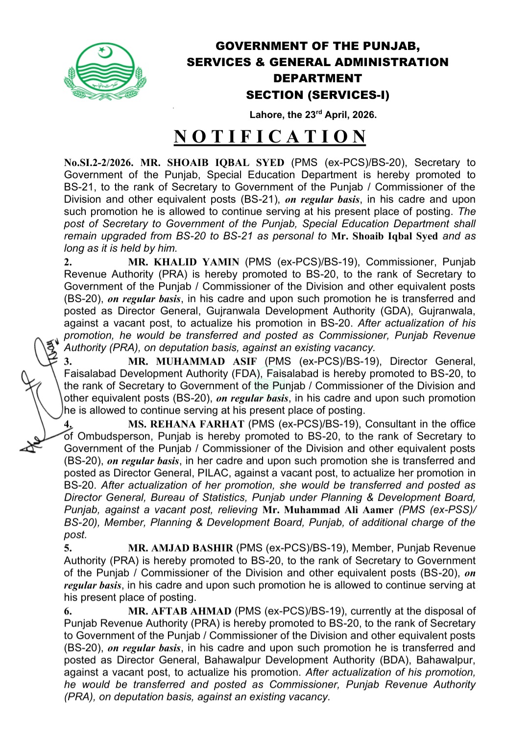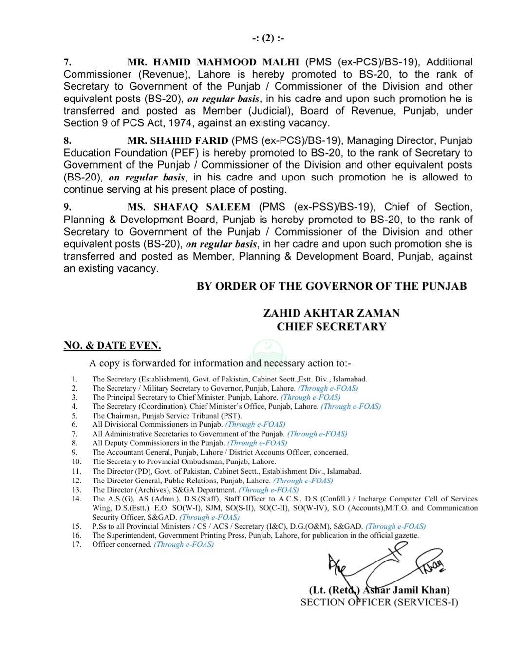 آفتاب احمد جو اس وقت پنجاب ریونیو اتھارٹی (PRA) میں تعینات ہیں کوBS-20 میں ترقی دے کر سیکرٹری حکومت پنجاب/ ڈویژن کے کمشنر اور دیگر مساوی پوسٹوں (BS-20) پر مستقل بنیادوں پر، اپنے کیڈر میں ترقی دی گئی ہے اور اس طرح ترقی پانے کے بعد انھیں ڈائریکٹر جنرل بہاولپور ڈویلپمنٹ اتھارٹی تعینات کیا گیا ہے ۔حامد محمود ملہی ایڈیشنل کمشنر (ریونیو) لاہور کو BS-20 میں ترقی کر پنجاب کے ریونیو بورڈ میں ممبر (PJJ) تعینات کیا گیا ہے۔شاہد فرید منیجنگ ڈائریکٹر، پنجاب ایجوکیشن فاؤنڈیشن کو گریڈ 20 میں ترقی دے کر موجودہ جگہ پر خدمات جاری رکھنے کی اجازت دی گئی ہے۔شفق سلیم چیف آف سیکشن، پلاننگ اینڈ ڈویلپمنٹ بورڈ، پنجاب کو یہاں BS-20 میں ترقی دے کر بطور ممبر پنجاب، پلاننگ اینڈ ڈویلپمنٹ بورڈ تعینات کیا گیا ہے۔