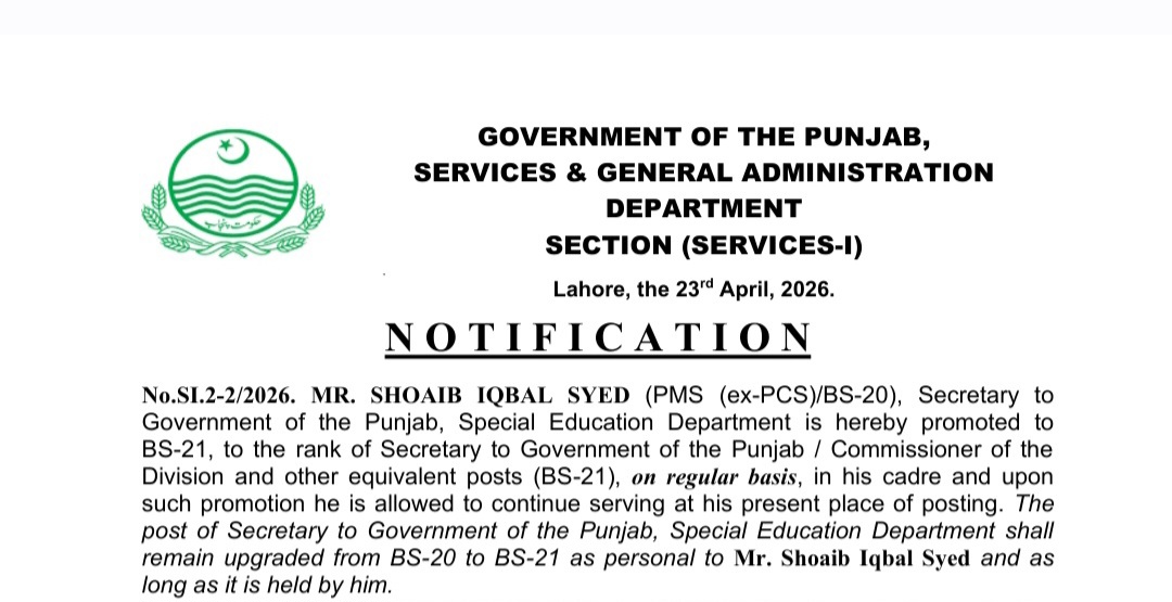 حکومت پنجاب نے 9 اعلٰی افسران کو گریڈ 21 اور 20 میں ترقیاں دینے کے بعد تقرریوں کا نوٹیفکیشن جاری کر دیا ہے۔چیف سیکرٹری پنجاب زاہد اختر زمان کی جانب سے جاری نوٹیفکیشن کے مطابق شعیب اقبال سید سیکرٹریسپیشل ایجوکیشن ڈیپارٹمنٹ کو یہاں BS-21 میں ترقی دے کر سیکرٹری ٹو گورنمنٹ آف گورنمنٹ/کمشنر آف ڈویژن اور دیگر مساوی پوسٹوں (BS-21) پر مستقل بنیادوں پر، اپنے کیڈر میں ترقی دے دی گئی ہے۔خالد یامین کمشنر، پنجاب ریونیو اتھارٹی (PRA) کو BS-20 میں ترقی دے کر ڈائریکٹر جنرل گوجرانوالہ ڈویلپمنٹ تعینات کیا گیا ہے