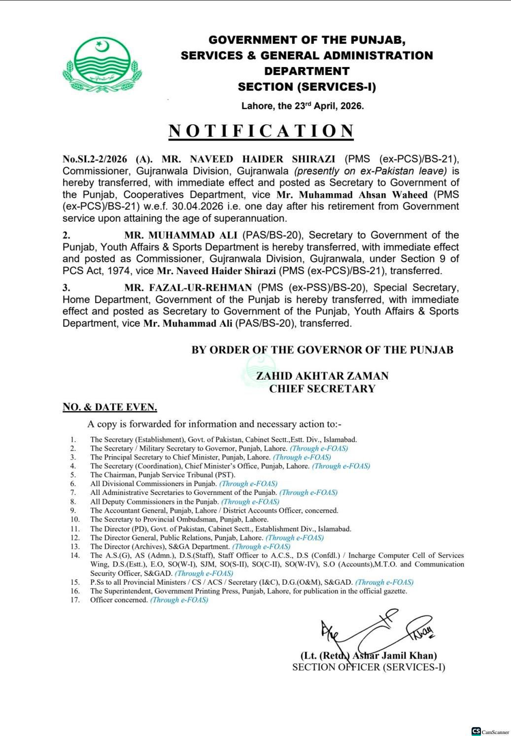 کمشنر گوجرانوالہ ڈویژن نوید حیدر شیرازی کو تبدیل کر دیا گیاہے انھیں سیکرٹری کوآپریٹو پنجاب لگا دیا گیا ہے۔سیکرٹری یوتھ افیئر / سپورٹس ڈیپارٹمنٹ محمد علی کو کمشنر گوجرانوالہ ڈویژن تعینات کیا گیا ہے۔سپیشل سیکرٹری داخلہ فضل الرحمٰن کو سیکرٹری یوتھ افئیر /سپورٹس تعینات کر دیا گیا ہے۔
