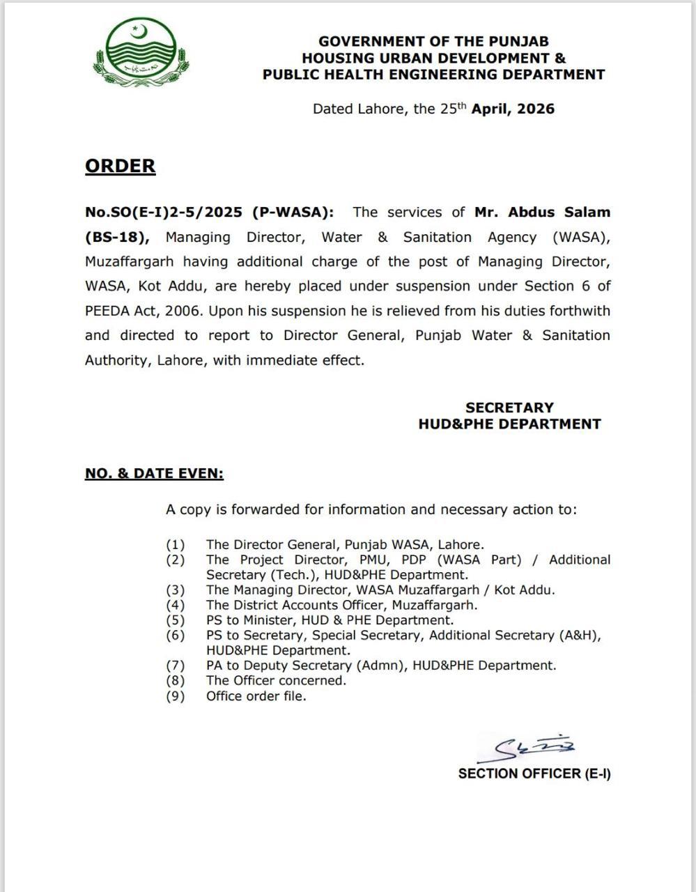 ایم ڈی واسا مظفر گڑھ اور کوٹ ادو کوشہری مسائل حل نہ کرنے پر عہدے سے ہٹا دیا گیا ہے۔ڈی جی واسا پنجاب رپورٹ کرنے کی ہدایت کی گئی ہے۔ایم ڈی واسا مظفر گڑھ عبدالسلام کے پاس ایم ڈی واسا کوٹ ادو کا اضافی چارج بھی تھا تھا۔سیکرٹری ہاؤسنگ نورالامین مینگل نے اہم احکامات جاری کر دیئے ہیں۔محکمہ ہاؤسنگ پنجاب کے ترجمان کے مطابق کارکردگی بہتر نہ کرنے پر ایکشن لیا گیا۔وزیر اعلیٰ پنجاب کے وژن کیمطابق ناقص کارکردگی پر زیرو ٹالرنس پالیسی ہے۔شہریوں کو بہتر سہولیات کی فراہمی حکومت کی اولین ترجیح ہے۔