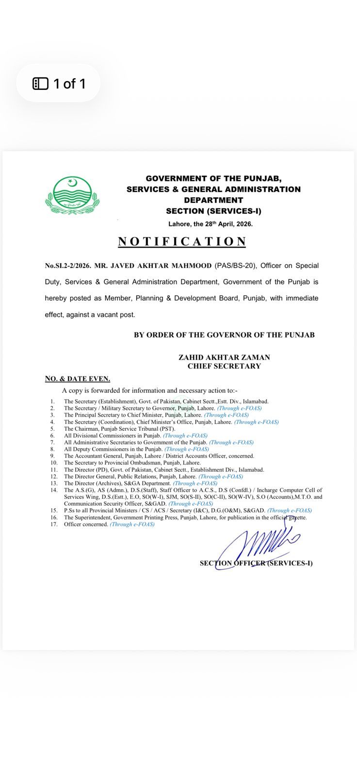 چیف سیکرٹری پنجاب زاہد اختر زمان کی جانب سے نوٹیفکیشن جاری کر دیا گیا ہے۔