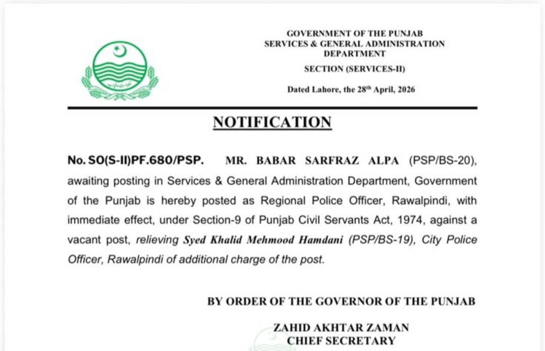 حکومت پنجاب نے تقرری کے منتظر گریڈ 20 کےبابر سرفراز کو ریجنل پولیس آفیسر راولپنڈی تعینات کر دیا ہے۔محکمہ سروسز میں ہی تقرری کے منتظر جاوید اختر محمود کو ممبر پلاننگ اینڈ ڈویلپمنٹ بورڈ پنجاب تعینات کیا گیا ہے۔