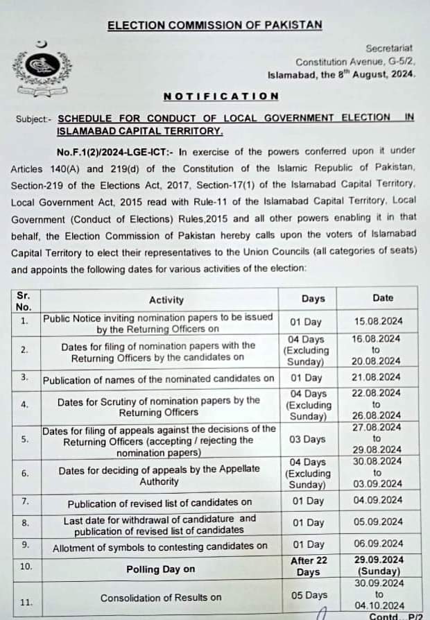 اسلام آباد میں بلدیاتی انتخابات کا شیڈول جاری,بلدیاتی انتخابات کیلئے پولنگ 29 ستمبر 2024 کو ہوگی۔الیکشن کمیشن آف پاکستان نے وفاقی دارالحکومت میں بلدیاتی انتخابات کا باقاعدہ شیڈول جاری کردیا ہے۔اس سلسلہ میں جاری نوٹیفکیشن کے مطابق بلدیاتی انتخابات کے لئے امیدواروں کو کاغذات نامزدگی کا اجراء 15 اگست سے شروع ہو جائے گا۔کاغذات جمع کروانے کے لئے 16تا 20 اگست کا ٹائم دیاگیا ہے۔امیدواروں کی ابتدائی فہرست 21 اگست کو آویزاں کی جائے گی۔کاغذات کی جانچ پڑتال 22 تا 26اگست ،اپیلوں کےلئے 27تا 29اگست اپیلوں پر فیصلوں کے لئے 30 اگست تا 3 ستمبر ،امیدواروں کی نظر ثانی شدہ فہرست 4 ستمبر مقرر کی گئی ہے۔کاغذات نامزدگی واپس لینے کی آخری تاریخ 5 ستمبرہے۔نشانات 6 ستمبر کو الاٹ کئے جائیں گے جبکہ پولنگ29 ستمبر کو ہوگی۔اسلام آباد میں مقامی حکومتوں کے انتخابات لوکل گورنمنٹ الیکشن رولز 2015 کے تحت کروائے جائیں گے۔