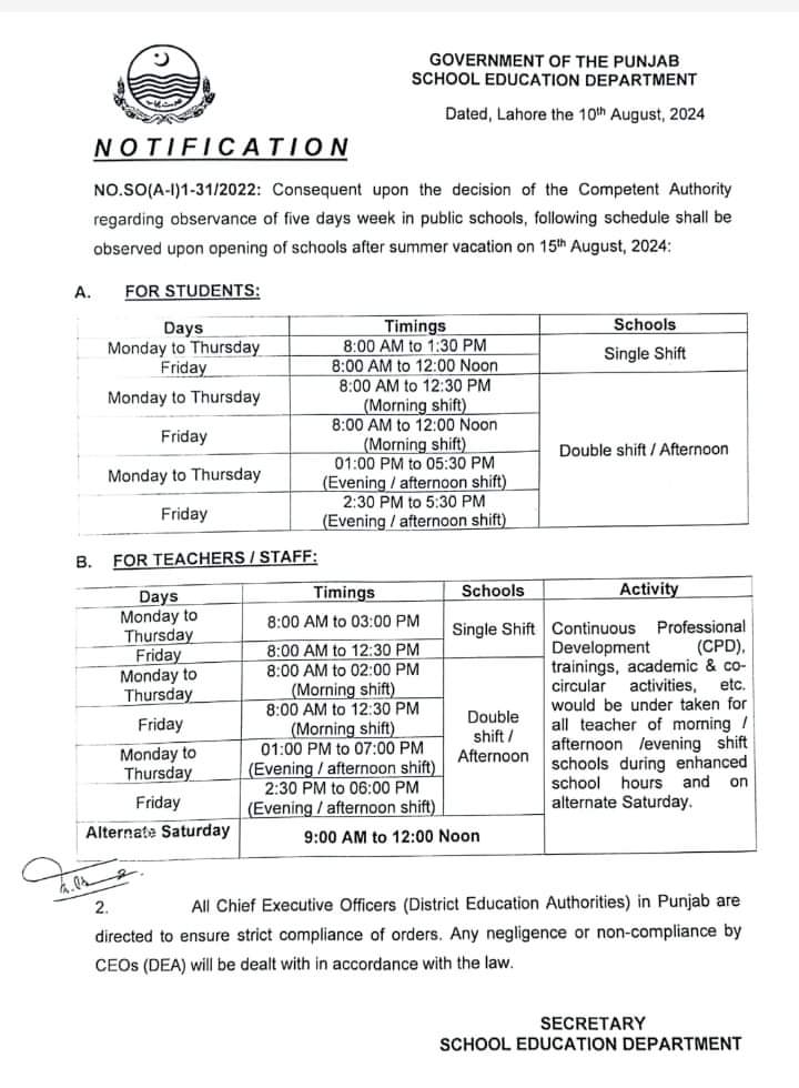 اس سلسلہ میں سکول ایجوکیشن ڈیپارٹمنٹ نے باقاعدہ نوٹیفکیشن جاری کردیا ہے
