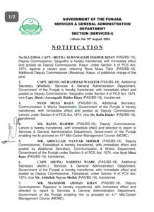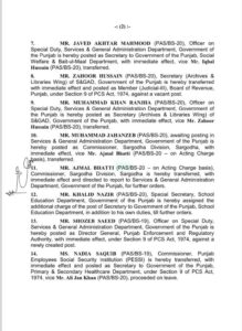 سروش فاطمہ شیرازی کو ڈپٹی کمشنر خوشاب تعینات کردیا گیا،سیکریٹری محکمہ زراعت جنوبی پنجاب ثاقب علی اطیل کو سیکرٹری محکمہ لائیو سٹاک تعینات کردیا گیا، سیکرٹری محکمہ لائیو سٹاک محمد مسعود انور کو چیف آف سیکشن پلاننگ اینڈ ڈویلپمنٹ تعینات کردیا گیا، سیکرٹری محکمہ سوشل ویلفیئر اقبال حسین کورس پر روانہ ، جاوید اختر محمود کو سیکرٹری محکمہ سوشل ویلفیئر تعینات کردیا گیا، کمشنر سرگودھا اجمل بھٹی کو محکمہ سروسز رپورٹ کرنے کی ہدایت، محمد جہانزیب کو کمشنر سرگودھا تعینات کردیا گیا،سپیشل سیکرٹری محکمہ سکول ایجوکیشن خالد نزیر کو سیکرٹری محکمہ سکول ایجوکیشن کا اضافی چارج سونپ دیا گیا، شوزب سعید کو ڈائریکٹر جنرل پنجاب انفورسمنٹ ریگولیٹری تعینات کردیا گیا، محمد علی کو کمشنر پنجاب ایمپلائز سوشل سیکورٹی تعینات کردیا گیا،
