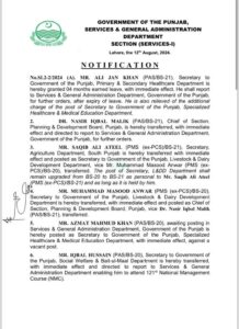 سیکرٹری محکمہ اسپیشلائزڈ اور محکمہ پرائمری اینڈ سکینڈری ہیلتھ کیئر علی جان کو عہدے سے ہٹا دیا گیا جبکہ انکی جگہ عظمت محمود کو سیکرٹری اسپیشلائزڈ اینڈ میڈیکل ایجوکیشن پنجاب تعینات کردیا گیااور نادیہ ثاقب کو سیکرٹری پرائمری اینڈ سکینڈری ہیلتھ تعینات کردیا گیا۔نوٹیفکیشن کے مطابق ڈپٹی کمشنر سرگودھا کیپٹن ریٹائرڈ اورنگزیب خان کو ڈپٹی کمشنر قصور تعینات کردیا گیا، کیپٹن ریٹائرڈ محمد وسیم کو ڈپٹی کمشنر سرگودھا تعینات کردیا گیا، سید موسی رضا کو ڈپٹی کمشنر لاہور تعینات کردیا گیا، ڈپٹی کمشنر لاہور رافعہ حیدر کورس پر روانہ،