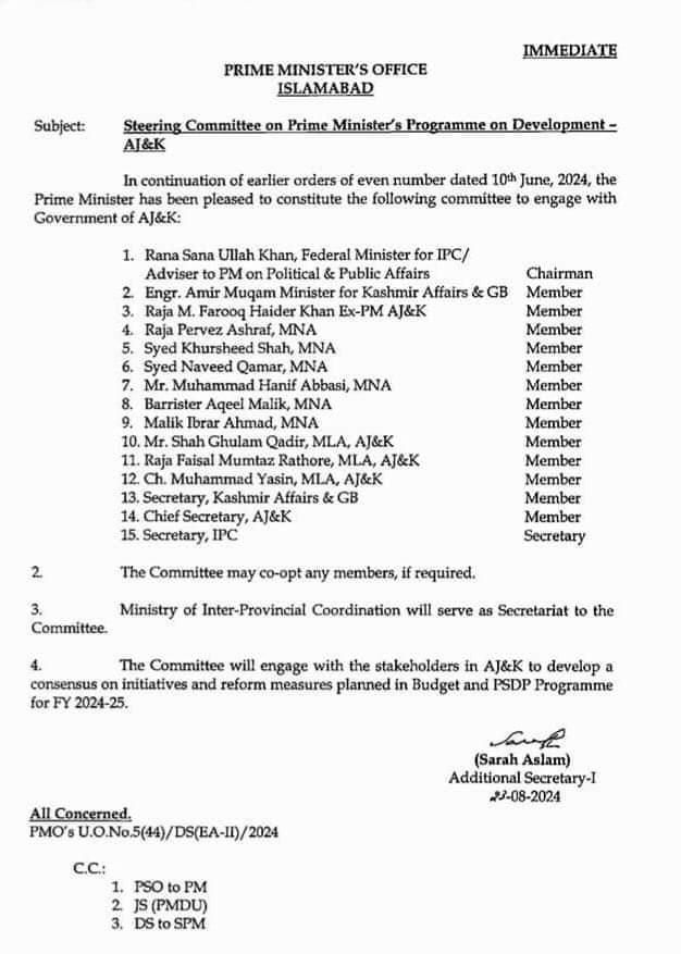 وزیر اعظم پاکستان میاں محمد شہباز شریف نے آزاد جموں و کشمیر کے معاملات کا جائزہ لینے،وعدوں کو پورا کرنے اور ترقی کے عمل میں شامل کرنے کے لئے وفاقی کمیٹی کا نیا نوٹیفکیشن جاری کردیا ہے۔ آزادکشمیر کے معاملات کیلۓ قاٸم اسٹیئرنگ کمیٹی میں پیپلزپارٹی آزادکشمیر کے صدر چوہدری یاسین اور سیکرٹری جنرل فیصل راٹھور کو بھی شامل کر لیا گیا۔وزیر اعظم کے پروگرام برائے ترقی آزاد جموں و کشمیر کی اسٹیئرنگ کمیٹی کے چیئرمین رانا ثناء اللہ خان وفاقی وزیر برائے آئی پی سی/ وزیر اعظم کے سیاسی اور عوامی امور کے مشیرہیں،ممبران میں انجینئر امیر مقام وزیر امور کشمیر و گلگت بلتستان، راجہ ایم فاروق حیدر خان سابق وزیر اعظم آزاد جموں و کشمیر، راجہ پرویز اشرف، ایم این اے،سید خورشید شاہ، ایم این اے،سید نوید قمر، ایم این اے،محمد حنیف عباسی ایم این اے،بیرسٹر عقیل ملک، ایم این اے، ملک ابرار احمد، ایم این اے، شاہ غلام قادر، ایم ایل اے، اے جے اینڈ کے،راجہ فیصل ممتاز راٹھور، ایم ایل اے، اے جے اینڈ کے 12۔ چوہدری۔ محمد یاسین، ایم ایل اے، اے جے اینڈ کے،سیکرٹری امور کشمیر اور جی بی،چیف سیکرٹری، اے جے اینڈ کےسیکرٹری آئی پی سی شامل ہیں۔کمیٹی وزارت بین الصوبائی رابطہ سیکرٹریٹ کے طور پر کام کرے گی۔کمیٹی مالی سال 2024-25 کے بجٹ اور پی ایس ڈی پی پروگرام میں طے شدہ اقدامات اور اصلاحاتی اقدامات پر اتفاق رائے پیدا کرنے کے لیے آزاد جموں و کشمیر کے اسٹیک ہولڈرز کے ساتھ مشغول ہو گی۔