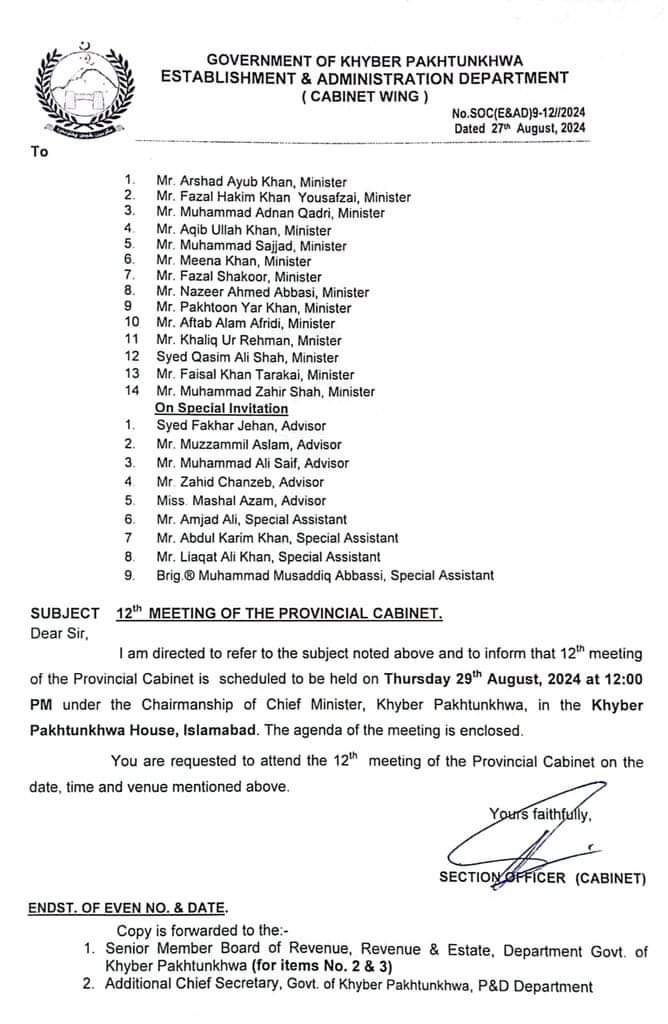 خیبر پختونخوا کی صوبائی کابینہ کا اجلاس 29 اگست کو خیبرپختونخوا ہاوس اسلام آباد میں منعقد ہوگا