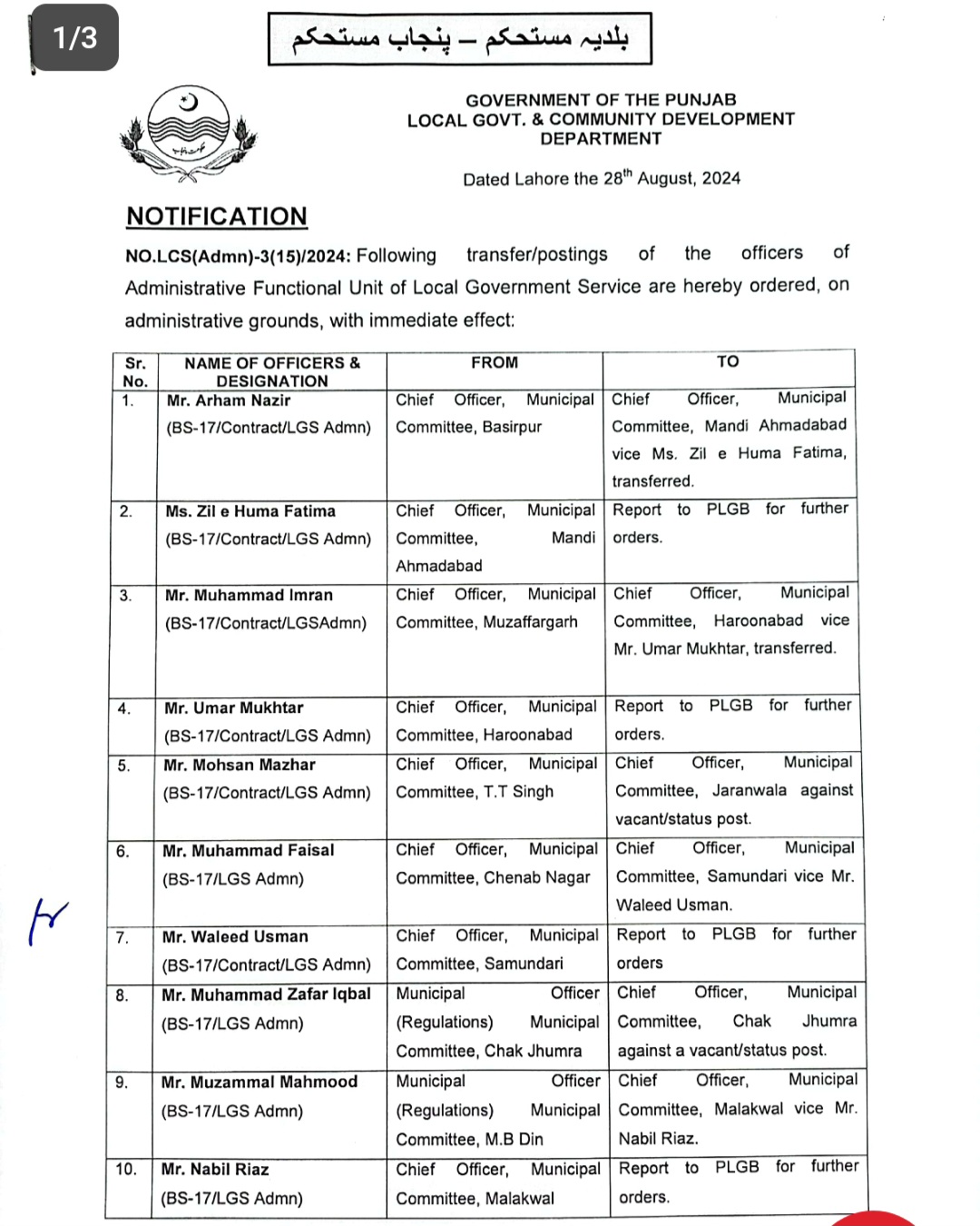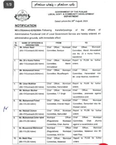 ارحم نذیر چیف آفیسر میونسپل کمیٹی بصیر پور کو چیف آفیسر منڈی احمد آباد تعینات کر دیا گیا ہے۔ چیف آفیسر منڈی احمد آباد ہما فاطمہ کو او ایس ڈی بنا دیا گیا ۔محمد عمران چیف آفیسر مظفر گڑھ کو چیف آفیسر ہارون آباد تعینات کر دیا گیا ہے۔عمر مختار چیف آفیسر ہارون آباد کو بورڈ رپورٹ کرنے کی ہدایت کی گئی ہے۔محسن مظہر کو چیف آفیسر جڑانوالہ تعینات کیا گیا ہے۔ محمد فیصل کو چیف آفیسر سمندری تعینات کر دیا گیا ہے۔ولید عثمان سی او سمندری کو بورڈ رپورٹ کرنے کی ہدایت کی گئی ہے۔