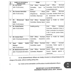 آصف جاوید کو چیف آفیسر میونسپل کمیٹی دریا خان تعینات کر دیا گیا ہے۔سمیرا سمیع اللہ کو چیف آفیسر گھکڑ منڈی تعینات کر دیا گیا ہے۔محمد منیر ملک چیف آفیسر گھکڑ منڈی کو بورڈ رپورٹ کرنے کی ہدایت کی گئی ہے۔ تقرری کے منتظر خالد رشید کو چیف آفیسر سیم۔سی نو شہراں ورکاں تعینات کر دیا گیاہے۔سید سبطین حیدکو چیف آفیسر روجھان تعینات کر دیا گیا ہے۔سی او ایم سی شجاع آباد عامر روؤف کو ڈسٹرکٹ کونسل راجن پور میں ڈسٹرکٹ آفیسر تعینات کر دیا گیاہے۔