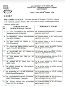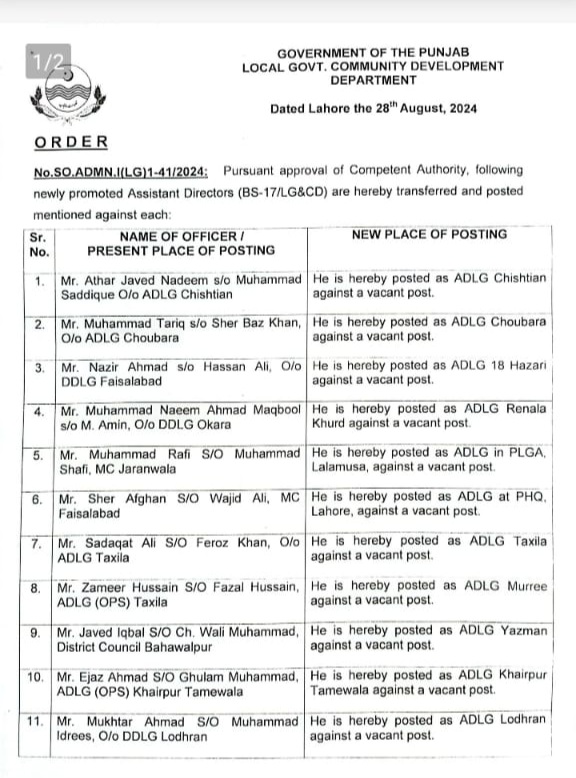 اے ڈی ایل جی اوکاڑہ کو وہاڑی ٹرانسفر کردیا گیا ہے۔اے ڈی ایل جی پھالیہ منصور حسین کی ڈی جی ایل جی اینڈ سی ڈی آفس خالی آسامی پرتقرری کی گئی ہے۔حال ہی میں گریڈ 17 میں ترقی پانے والے 14 افسران کی بطور اسسٹنٹ ڈائریکٹرز لوکل گورنمنٹ اینڈ کمیونٹی ڈویلپمنٹ تقرریاں کی گئی ہیں۔اس سلسلہ میں جاری نوٹیفکیشن کے مطابق اطہر جاوید ندیم کو اے ڈی ایل جی چشتیاں، محمد طارق کو چوبارہ،نذیر احمد کو 18ہزاری،محمد نعیم احمد مقبول کو رینالہ خورد، محمد رفیع لالہ موسی ،شیر افگن کو اے ڈی ایل جی صوبائی ہیڈکوارٹر لاہور، شفقت علی کو ٹیکسلا، ضمیر حسین کی مری،جاوید اقبال یزمان، اعجاز احمد خیر پور ٹامیونوالی، ممتاز احمد لودھراں اور محمد منیر اختر کی اے ڈی ایل جی خان پور تقرری کی گئی ہے۔محمد بلال کو اے ڈی ایل جی phq تعینات کیا گیا ہے۔