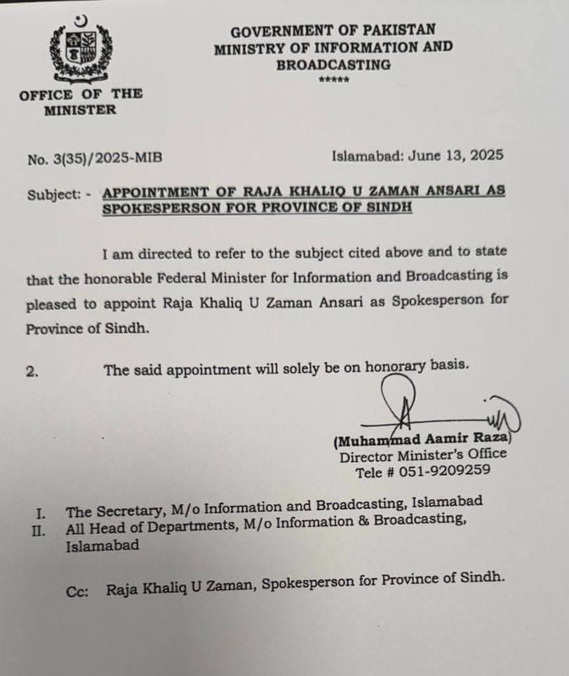 وزارت اطلاعات و نشریات نے راجہ خلیق الزمان انصاری کی تقرری کا نوٹیفیکیشن جاری کر دیا وفاقی وزیر اطلاعات عطاء اللہ تارڑ نے راجہ خلیق الزمان انصاری کو وزارت اطلاعات کے لئے صوبہ سندھ کا ترجمان مقرر کرنے کی منظوری دی۔راجہ خلیق الزمان انصاری کی تقرری خالصتاً اعزازی بنیادوں پر کی گئی ہے۔اس موقع پر وزیر مملکت مذہبی امور بینالمذاہب ہم آہنگی کھیل داس کوھستانی وزیراعظم کے ڈجیٹل میڈیا کے مشیر بدر شہباز بھی موجود تھے