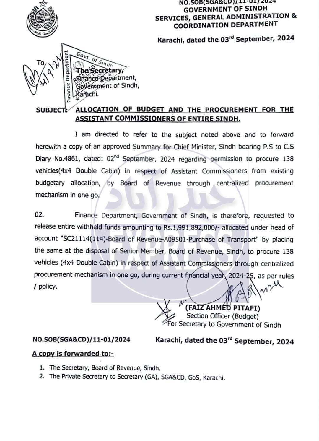سندھ حکومت نے سندھ کے 133 اسسٹنٹ کمشنرز کے لئے نئی ڈبل کئبن ویگو گاڑیاں خریدنے کے لئے 2 ارب روپے سے زائد رقم کی منظوری دے دی۔سیکشن آفیسر بجٹ محکمہ خزانہ کی طرف سے لیٹر بھی جاری کردیا گیا ہے۔اندرون سندھ میں تعینات اسسٹنٹ کمشنرز کے لئے نئی گاڑیاں خریدیں جا رہی ہے۔