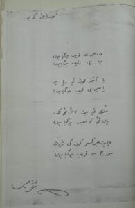 ثروت حسین کے ہاتھ سے لکھی ہوئی یہ غزل شاید غیر مطبوعہ ہے. یہ انہوں نے برادرم رفیق احمد نقش کو ان کے قلمی جریدے کیلئے دی تھی. اس کیلئے بشیر عنوان صاحب کا شکریہ.