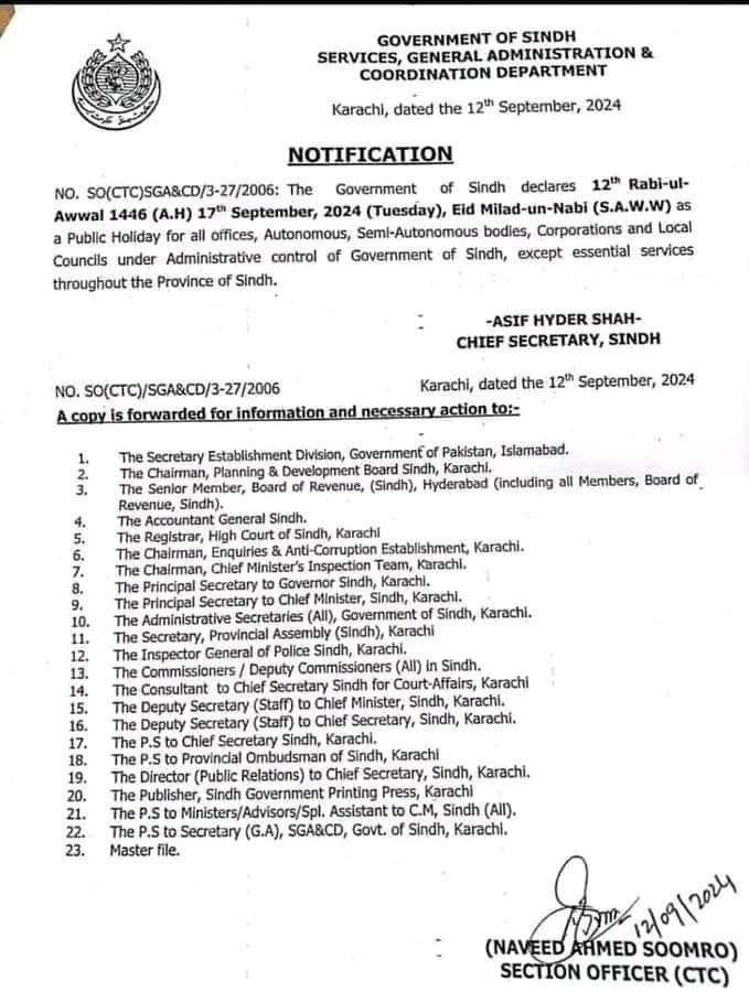 سندھ حکومت نے عید میلاد النبی ص کے موقع 17 ستمبر کو سندھ بھر میں عام تعطیل کا اعلان کر دیا ہے۔اس سلسلہ میں چیف سیکرٹری سندھ کی طرف سے نوٹیفکیشن جاری کیا گیا ہے۔جس کا اطلاق سندھ بھر کے سرکاری، نیم سرکاری اور بلدیاتی اداروں میں ہوگا۔