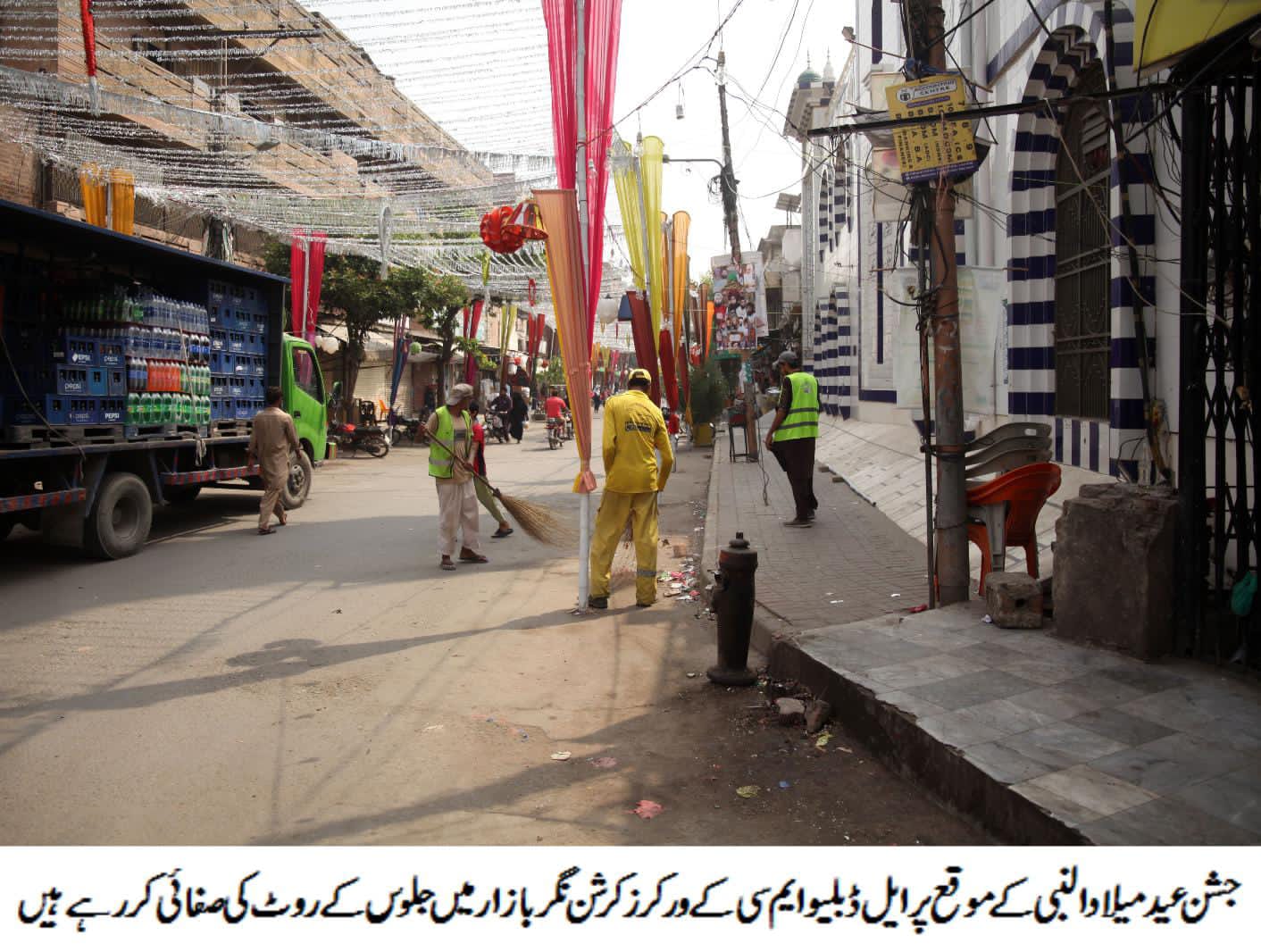 جشن عید میلادالنبی (صلی اللہ علیہ وسلم) کی تیاریاں عروج پر ہے۔ سی ای او ایل ڈبلیو ایم سی کی ہدایت پر شہر بھر میں ایل ڈبلیو ایم سی کی صفائی ٹیمیں متحرک ہیں۔ محفل میلاد مصطفی کی مناسبت سے لاہور کے 9ٹاؤنز میں 214 مساجد کی واشنگ مکمل کر لی گئی ہے جبکہ 120 سے زائد چھوٹے بڑے جلوسوں کے روٹس پر ورکرز تعینات ہیں۔ سی ای او بابر صاحب دین کا کہنا ہے کہ 800 سے زائد سینٹری ورکرز میلاد کی محافل اور مساجد کے گرد ڈیوٹی سر انجام دے رہے ہیں۔ لاہوریوں کو صاف ستھرا ماحول فراہم کرنا ہی اولین ترجیح ہے اس مقصد کے حصول کے لیے کرشن نگر، اسلام پورہ بازار، عالمگیر روڈ، موہنی روڈ پر صفائی ٹیمیں متحرک ہیں۔ فورٹ روڈ، بھاٹی گیٹ، اردو بازار، گوالمنڈی بازار میں بھی صفائی ستھرائی کا عمل جاری ہے جبکہ تمام اہم شاہراہوں پر مکینیکل سویپنگ بھی کی جارہی ہے۔ شہریوں سے بھی گزارش ہے کہ اپنے ارد گرد کے ماحول کو صاف بنانے میں ایل ڈبلیو ایم سی ٹیموں کا ساتھ دیں۔ کوڑا ہمیشہ کوڑے دان میں ڈالیں۔ صفائی سے متعلق شکایات کے ازالے کے لیے ایل ڈبلیو ایم سی کی ہیلپ لائن 1139پر رابطہ کریں یا سوشل میڈیا کا استعمال کریں۔
