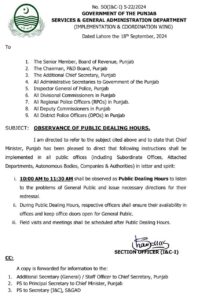 پبلک ڈیلنگ کے اوقات کے دوران متعلقہ افسران دفاتر میں اپنی دستیابی کو یقینی بنائیں گے اور دفتر کے دروازے عام لوگوں کے لیے کھلے رکھیں گے۔فیلڈ وزٹ اور میٹنگز پبلک ڈیلنگ اوقات کے بعد طے کی جائیں گی۔ تمام سرکاری دفاتر (بشمول ماتحت دفاتر، منسلک محکموں، خود مختار اداروں، کمپنیوں اور اتھارٹیز) وزیر اعلٰی کے ان احکامات پر عمل درآمد یقینی بنائیں گے۔
