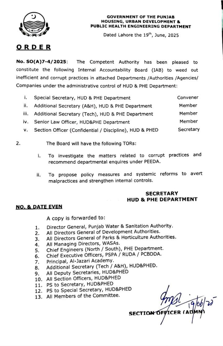 وزیر اعلی پنجاب کے احکامات، ترقیاتی منصوبوں میں شفافیت اور بہترین معیار کے لئےمحکمہ ہاؤسنگ و پبلک ہیلتھ میں پہلی دفعہ اندرونی احتساب بورڈ قائم کر دیا ہے۔اندرونی احتساب بورڈ محکمہ ہاوسنگ اور ذیلی اداروں میں کرپشن شکایات کے خلاف کاروائی کرے گا۔بورڈ بدعنوانی کی تحقیقات کرکے پیڈا ایکٹ کے تحت کارروائی تجویز کرے گا۔محکمہ ہاوسنگ، اتھارٹیز اور ایجنسیوں میں اصلاحات، پالیسی اقدامات کی سفارش بھی کرے گا۔سپیشل سیکرٹری ہاؤسنگ و پبلک ہیلتھ ڈیپارٹمنٹ بورڈ کے کنوینر مقرر کئے گئے ہیں۔سیکشن آفیسر (ڈسپلن) کو بورڈ کا سیکرٹری نامزد کر دیا گیا ہے۔سیکرٹری ہاؤسنگ کی ہدایت پر تمام واساز، ڈویلپمنٹ اور پارکس اتھارٹیز کو مراسلہ جاری کر دیا گیا ہے۔سیکرٹری ہاؤسنگ نور الامین مینگل نے کہا ہے کہ وزیر اعلٰی پنجاب کے میرٹ و شفافیت ویژن کے مطابق اندرونی احتساب تشکیل دیا گیا۔محکمہ ہاوسنگ اربوں روپے کے ترقیاتی کام کرتا ہے۔کڑا احتساب عوامی منصوبوں میں شفافیت کو برقرار رکھنے میں مدد گار ہو گا۔