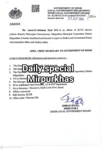 میونسپل کارپوریشن میر پور خاص کےمیونسپل کمشنر انیس الرحمن سیال کو او ایس ڈی بنا دیا گیا ہے۔محکمہ بلدیات سندھ نے انھیں سیکرٹری لوکل گورنمنٹ بورڈ کورپورٹ کرنے کا حکم دیا ہے ۔